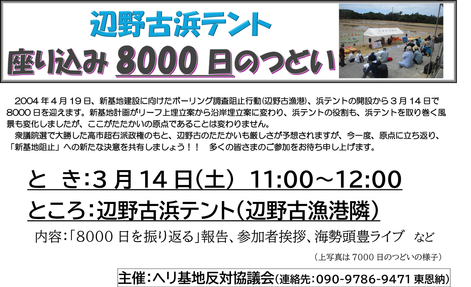 2004年4月19日、新基地建設に向けたボーリング調査阻止行動(辺野古漁港)、浜テントの開設から3月14日で8000日を迎えます。新基地計画がリーフ上埋立案から沿岸埋立案に変わり、浜テントの役割も、浜テントを取り巻く風景も変化しましたが、ここがたたかいの原点であることは変わりません。