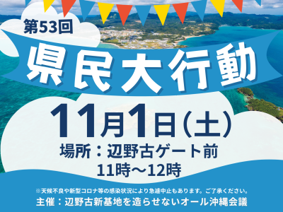 日頃より辺野古新基地建設反対運動に対するご奮闘に敬意を表します下記の日程にて県民大行動の実施が決まりましたのでお知らせします。関係者への周知をよろしくお願い致します。 日時 11月1日(土)11時 ~ 12時 場所 辺野... Read More