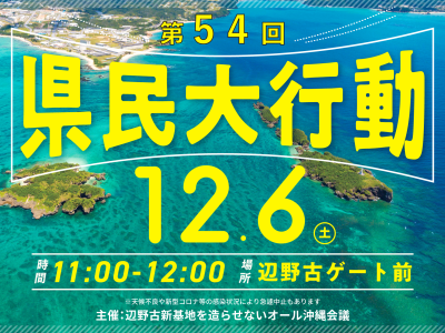 日頃より辺野古新基地建設反対運動に対するご奮闘に敬意を表します下記の日程にて県民大行動の実施が決まりましたのでお知らせします。関係者への周知をよろしくお願い致します。 日時 12月6日(土)11時 ~ 12時 場所 辺野... Read More